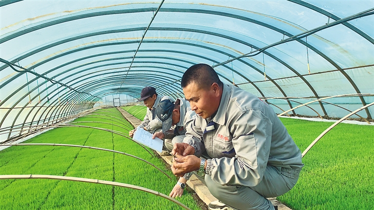 信贷支持企业的种业工作人员正在查看稻苗生长情况